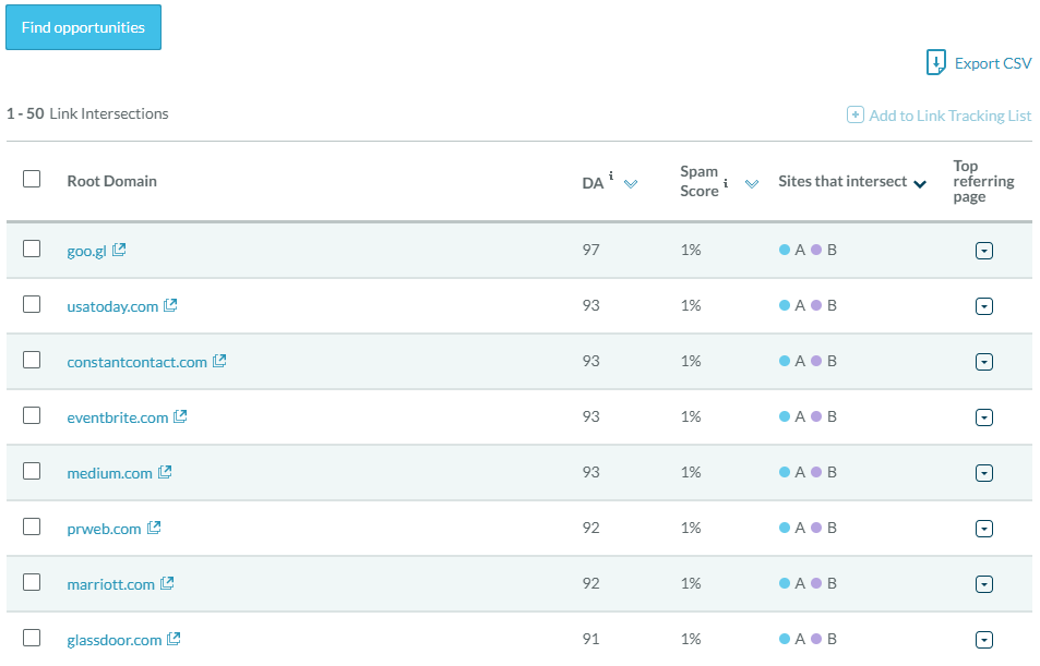 We’ll come back to Link Tracking Lists when we talk about outreach, but for now, all you need to know is that you can add the desirable competitor links (in our case, links from Isleta and Sandia) to Link Tracking lists straight from Link Intersect, making it easy to manage your data.