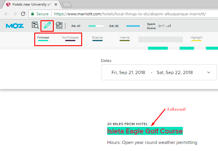 Select the MozBar icon from your browser and click the pencil icon. If you want to see Followed links, select “Followed” and the MozBar will highlight these links on the page in green. To find No-Followed links, click “No-Followed” and MozBar will highlight these links on the page in pink.