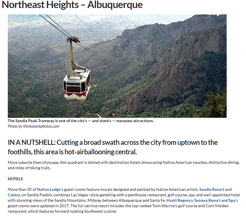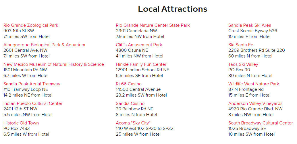 Link Intersect also yielded links to various travel guide websites. There are plenty of links on websites like these to local attractions. In the following example, you can see an Albuquerque travel guide that’s broken up by category, “hotels” being one of them:
