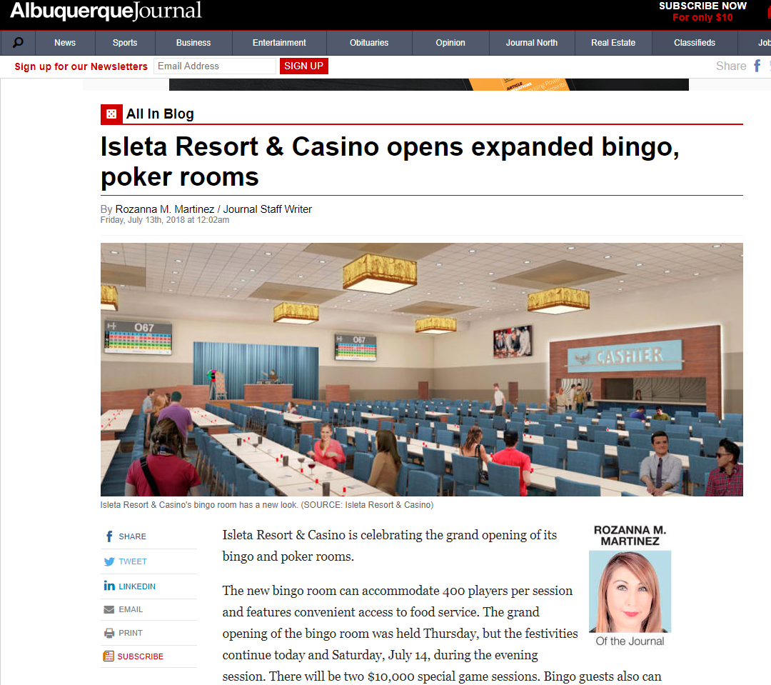 Isleta and Sandia also have been featured in the Albuquerque Journal. In this example, a local reporter covered news that Isleta was opening expanded bingo and poker rooms. This seems to be a journalist who covers local businesses, so she could be a great connection to make!