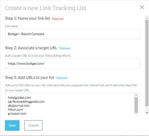 Make sure to put your client’s domain in the “target URL” field. For Step 3, since we’ve just selected the links we want to track from Link Intersect, those will already be populated in this field, so no further action is needed other than to click “Save.”