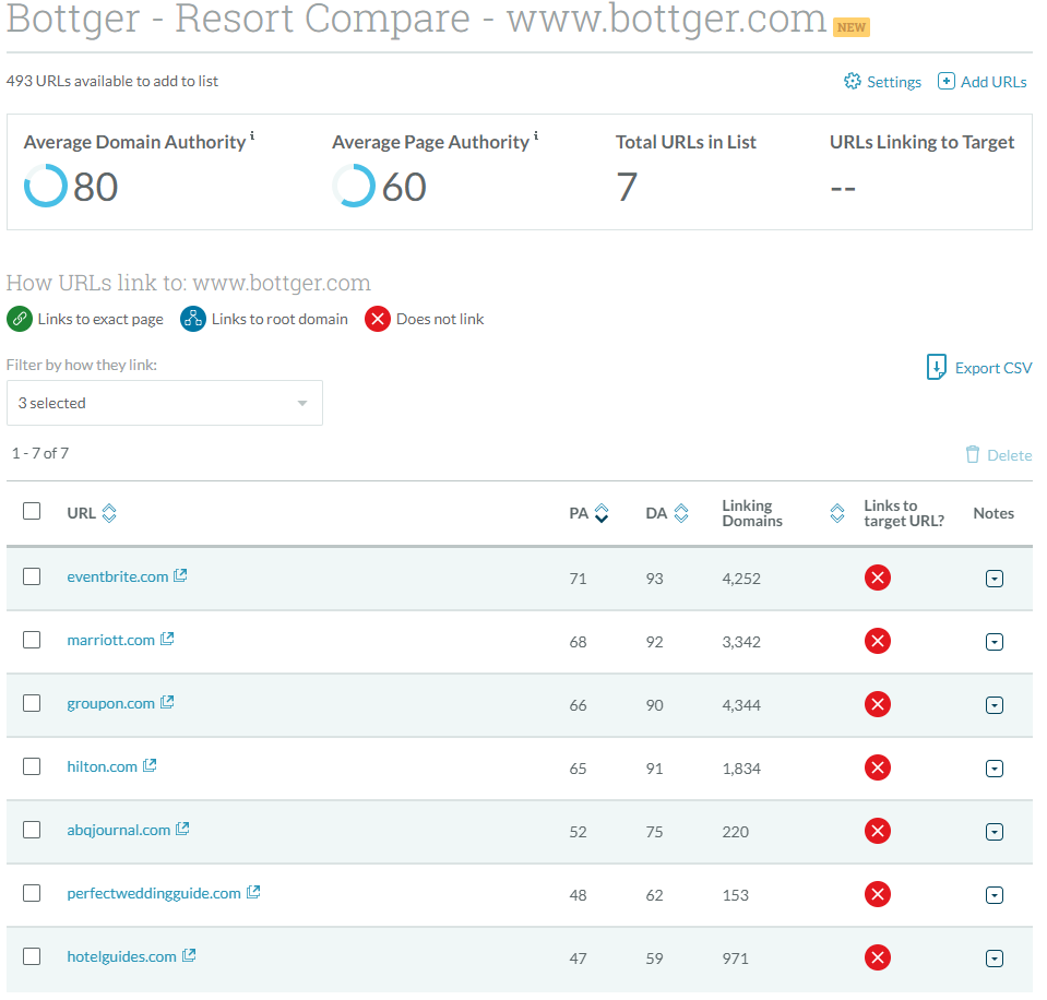 Next to Bottger’s domain, we’ve selected “root domain” as that will show us all competitor links who haven’t linked to us at all. We’re also going to select “root domain” on the resort domains, so we can see all of their backlinks, rather than just links to particular pages on their sites.