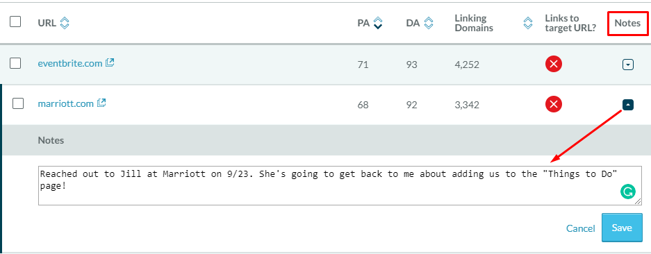 Another handy feature is the “Notes” dropdown. This allows you to keep track of your outreach attempts, which can be one of the trickiest parts about link building!