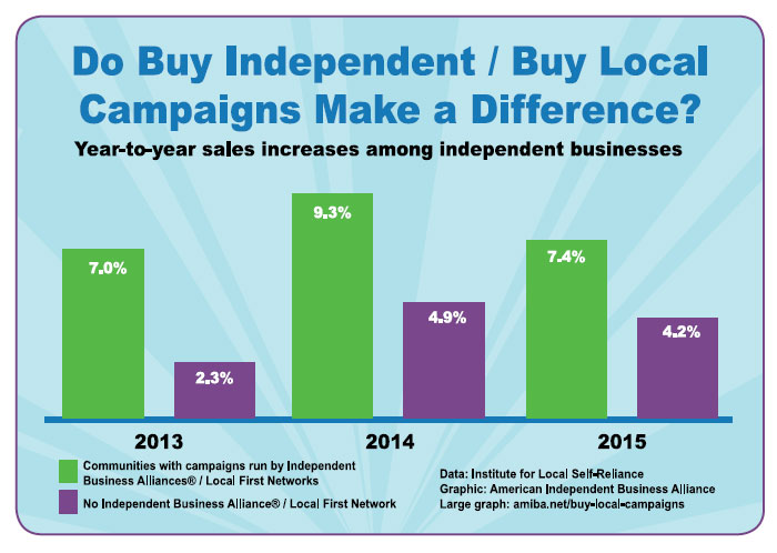 “Businesses in communities with a sustained grassroots “buy independent/buy local” campaign reported a strong 7.4% sales increase, nearly doubling the 4.2% gain for those in areas without such an alliance.”