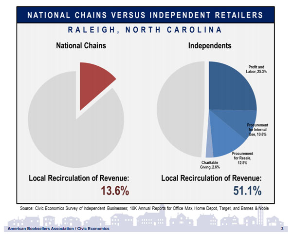 The analysts at Civic Economics conducted surveys of 10 cities to gauge the local financial impacts of independents vs. chain retailers, yielding a series of graphics like this one: