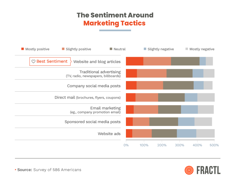 Fractl surveyed 500+ people and asked them if they felt positively, negatively, or neutrally about different marketing tactics. Website and blog articles had the best sentiment. Website ads had the worst sentiment.
