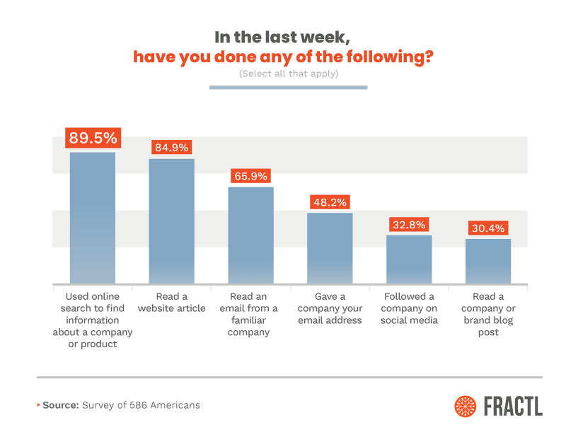 Fractl surveyed 500+ people and asked them, “In the last week, have you done any of the following?” The top result at 89% was “Used online search to find information about a company or product.” The bottom result at 30.4% was “Read a company or brand blog post.”