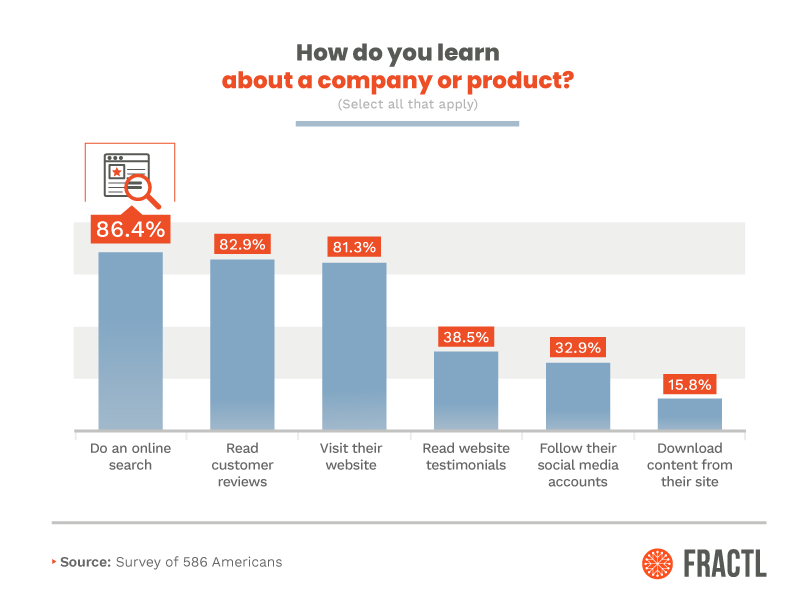 Fractl surveyed 500+ people and asked them, “How do you learn about a company or product?” The top result at 86.4% was “Do an online search.” The bottom result at 15.8% was “Download content from their site.”