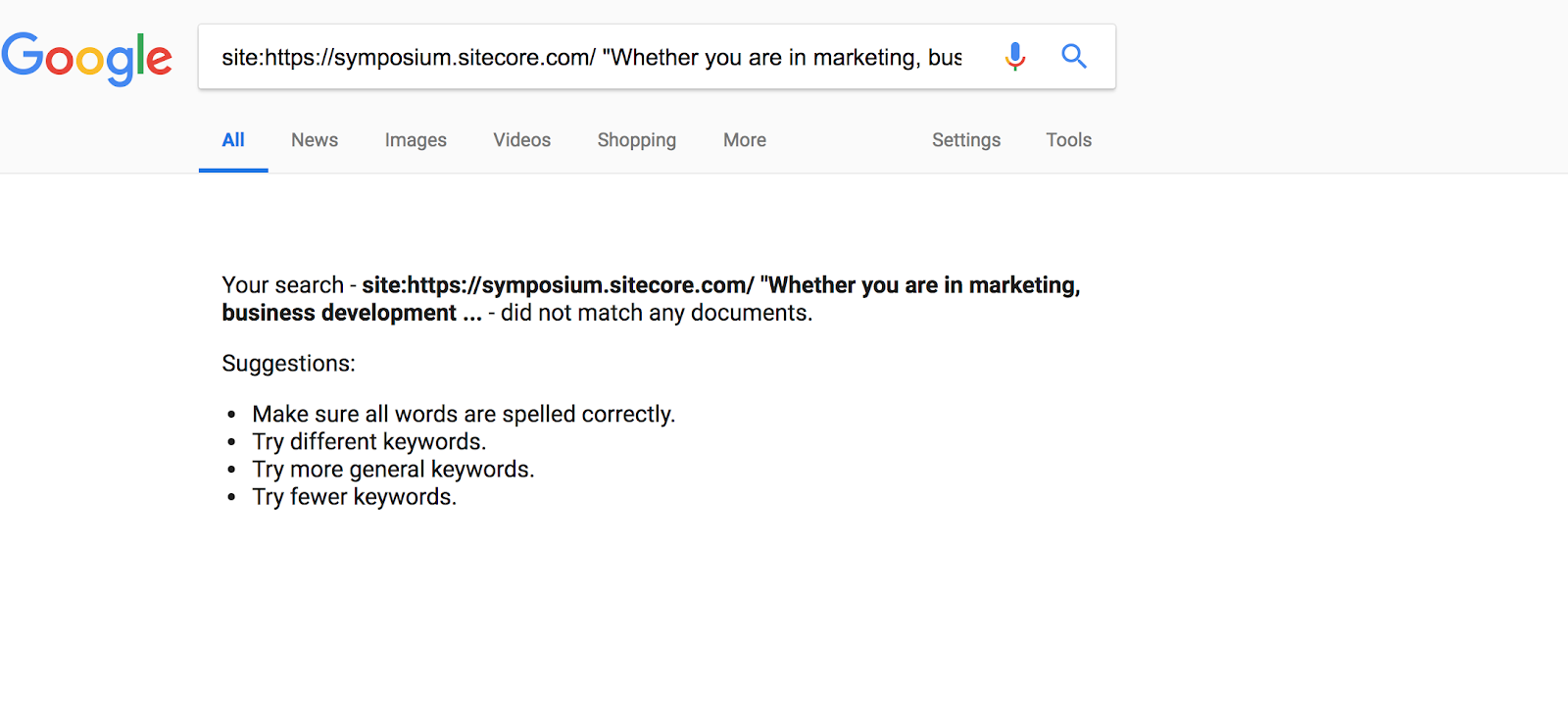 When we do a site:search for this exact phrase, for this exact page, we get nothing. This means Google hasn’t indexed the content.