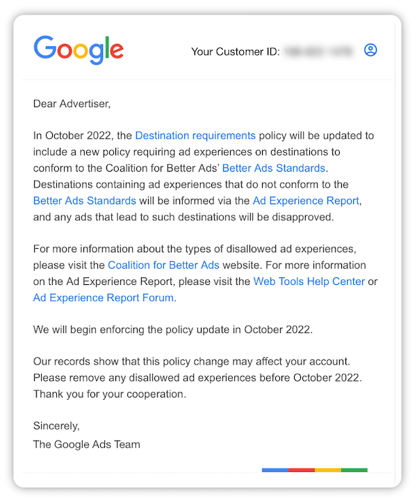 In October 2022, the Destination requirements policy will be updated to include a new policy requiring ad experiences on destinations to conform to the Coalition for Better Ads’ Better Ads Standards. Destinations containing ad experiences that do not conform to the Better Ads Standards will be informed via the Ad Experience Report, and any ads that lead to such destinations will be disapproved.