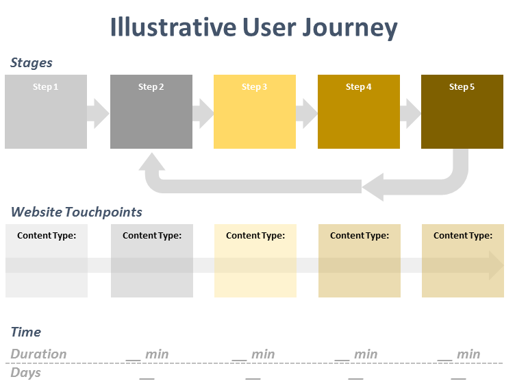 Sometimes when trying to process complex problems, it’s easier to break it down into smaller pieces. Illustrative user journeys can help with this problem! Take a single user’s journey and map it out, aligning relevant content experiences.