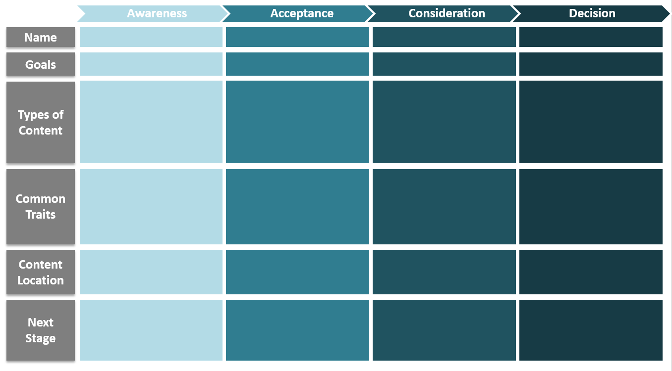 This chart is deceptively simple; however, working through this graph can help sites to understand how each stage in the funnel affects users (note: the stages can be modified). This matrix can help with mapping who writers are talking to, their needs, and how to push them to the next stage in the funnel.