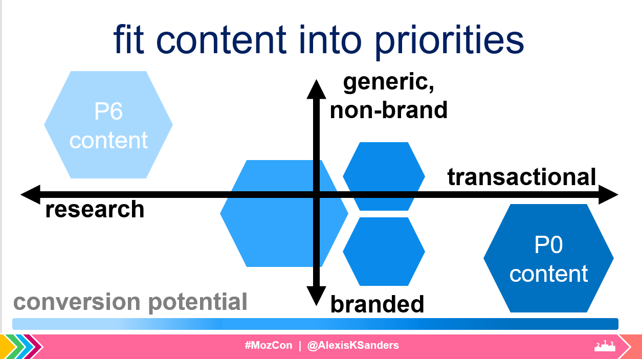 Mapping out content by intent and branding helps to visualize conversion potential. I find these extremely useful for prioritizing top-converting content initiatives (i.e., start with ensuring branded, transactional content is delivering the best experience, then move towards more generic, higher-funnel terms).