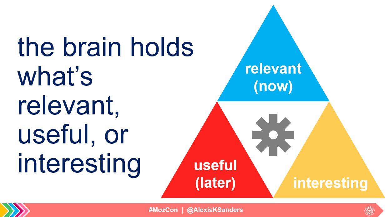 - From there we must be memorable. The brain tends to hold onto what’s relevant, useful, or interesting. Luckily, the searcher’s interest is already piqued (even if they aren’t consciously aware of why they searched for a particular topic).