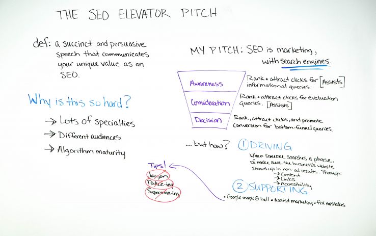 It’s a question every SEO has had to answer at some point, whether to your family members over the holidays or to the developer who will eventually implement your suggestions. If you don’t have a solid elevator pitch for describing your job, this is the Whiteboard Friday for you! Learn how to craft a concise, succinct description of life as an SEO without jargon, policing, or acting like a superhero.