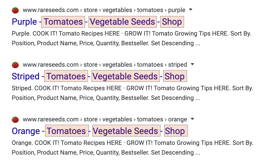 In this example below, the boilerplate text on every title includes “Tomatoes – Vegetable Seeds – Shop.”