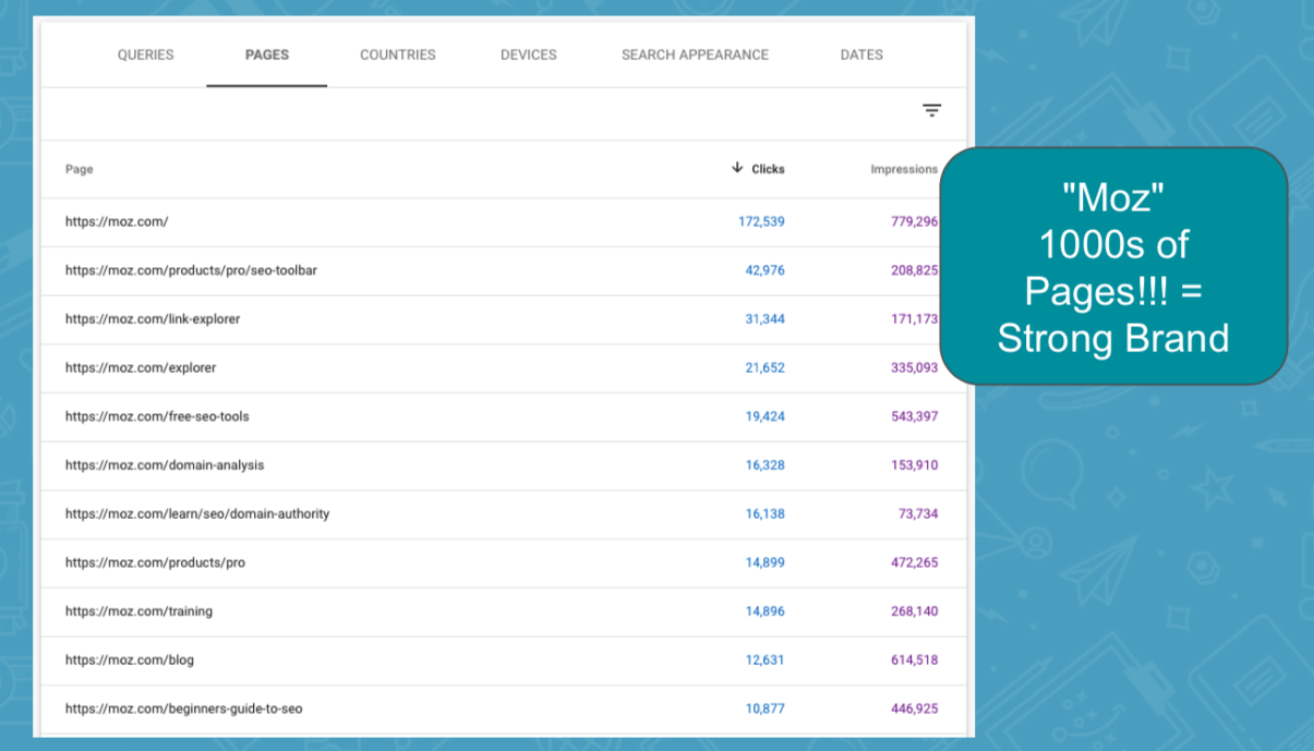 As our brand name is part of so many queries and leads to visits across thousands of pages, this tells us that “Moz” is a very strong brand, and we’d likely be smart to include it as part of our title tags.