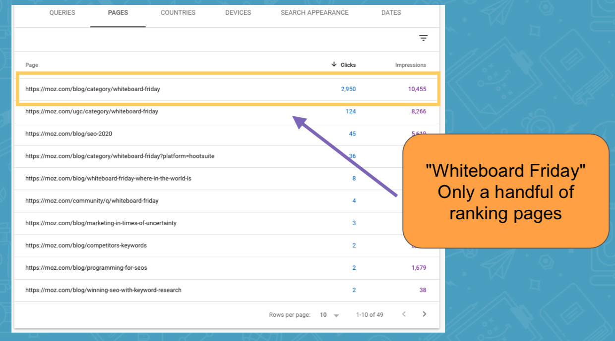 In this case, almost all the traffic for “Whiteboard Friday” search terms goes to only one or two pages.