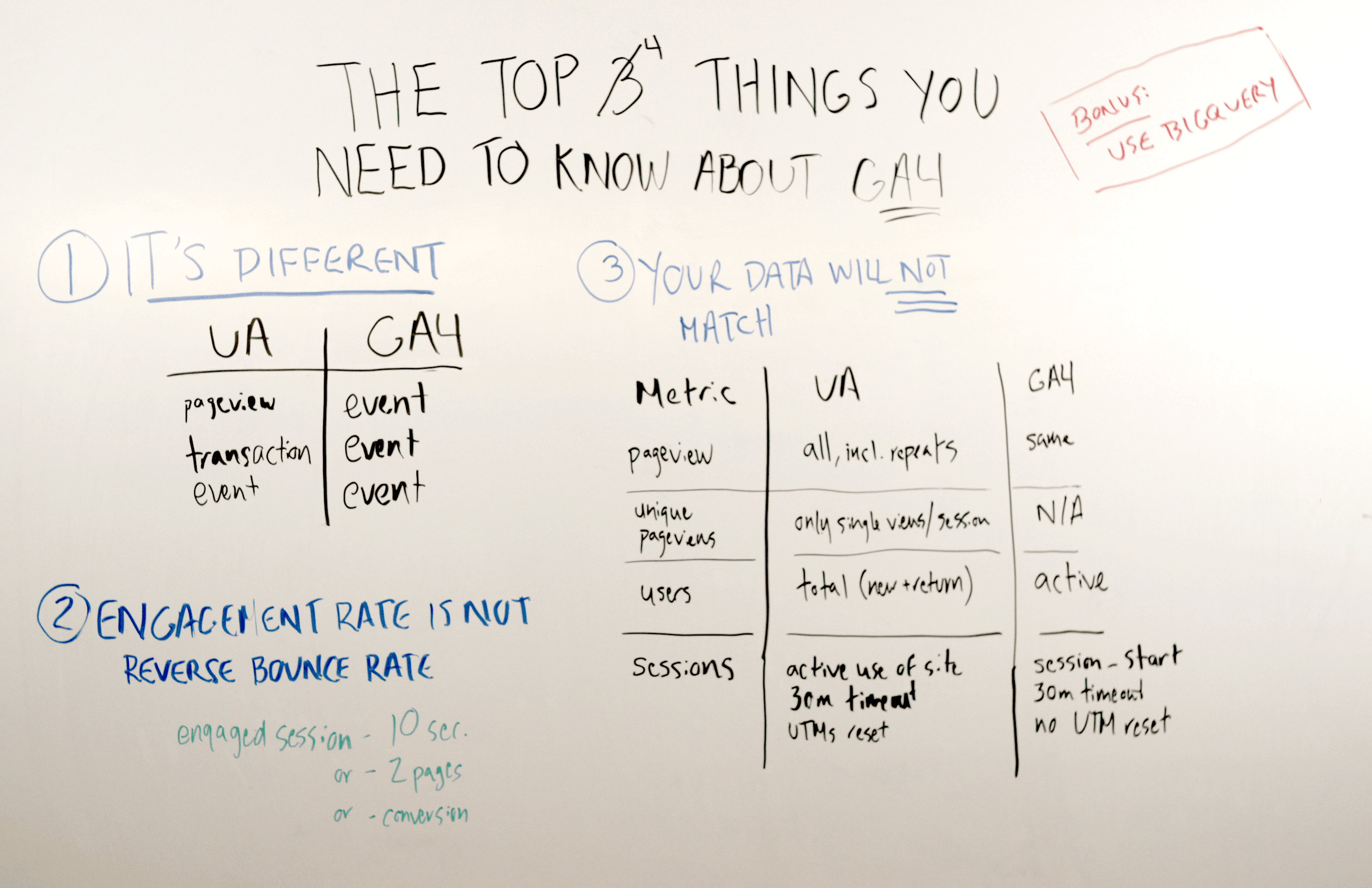 So, I mean, if you have that kind of dialogue with your leadership, you really need to have a conversation about the idea of accuracy in analytics, as in it isn’t, and error and everything else. But I mean, really the data is going to be different, and sometimes it’s a lot different. It’s not just a little bit different. And it’s because GA4 measures stuff differently than UA did. There is a page on Google Analytics Help, which goes into it in depth. But here are some of the highlights that I think you should really know sort of off the top of your head when you’re talking to people about this.