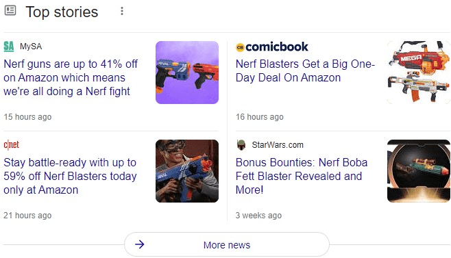 Back in December of 2021, Google launched a redesigned version of Top Stories on desktop that got relatively little notice. At first glance, it appeared that Google introduced a two-column design, such as this Top Stories pack for “Nerf”: