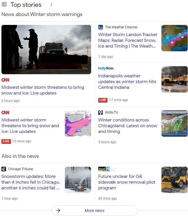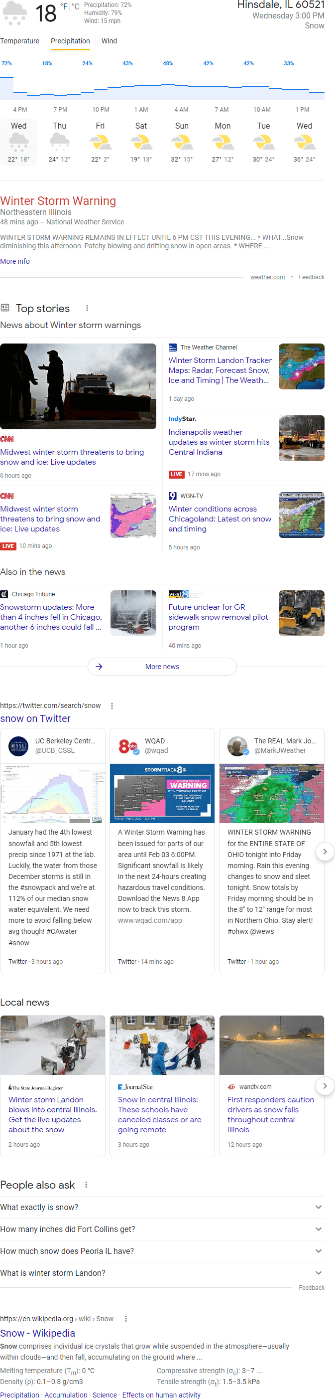 Over time, SEOs spotted a rarer but more interesting variety, the 7-pack. Here’s one for “snow” (a topic very much on my mind in Chicago as I’m writing this post):
