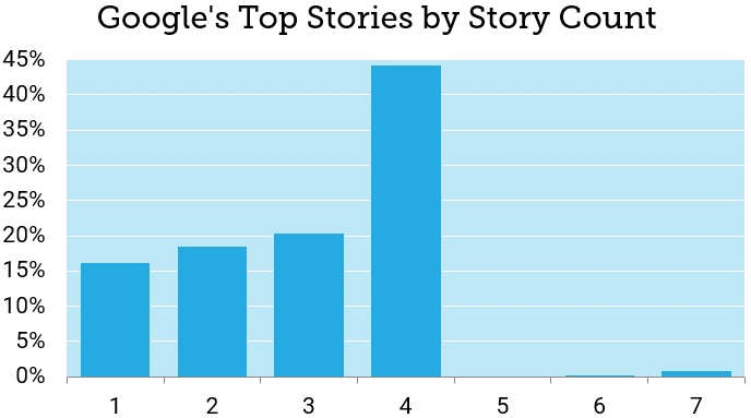 It’s easy to focus on the most extreme examples, but how often is this 7-pack variety actually occurring? Across the MozCast 10,000-keyword daily tracking set on February 3rd, we captured 2,121 page-one SERPs with Top Stories. Here’s the breakdown by story count: