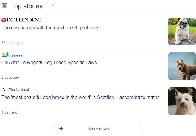 In our data set, the 7-pack is pretty rare (<1%), with a bit under half (44%) of Top Stories packs containing four stories. Interestingly, there is a design break between three and four stories. Top Stories packs with three or fewer stories are presented in list format, like this one from a search for “dog breeds”:
