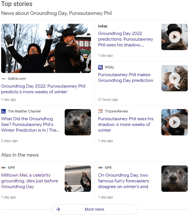 Note that, because the news itself is always changing, even the presence of Top Stories packs is very dynamic. Their presence across SERPs follows a cycle that peaks around Wednesday or Thursday and falls off into Sunday and Monday. Some searches may shift intent only on special occasions. For example, consider my search for “groundhog” on February 2nd: