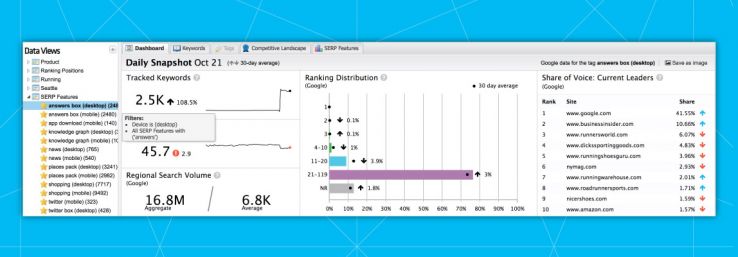If your strategy includes a hunt for the coveted position zero, you’re in luck. We like to use STAT’s dynamic tagging feature to monitor the keywords that result in featured snippets. This way, we can track keywords where our client owns the snippet and where they don’t. We can also highlight new opportunities to create optimized content and attempt to capture the spot from their competitors.