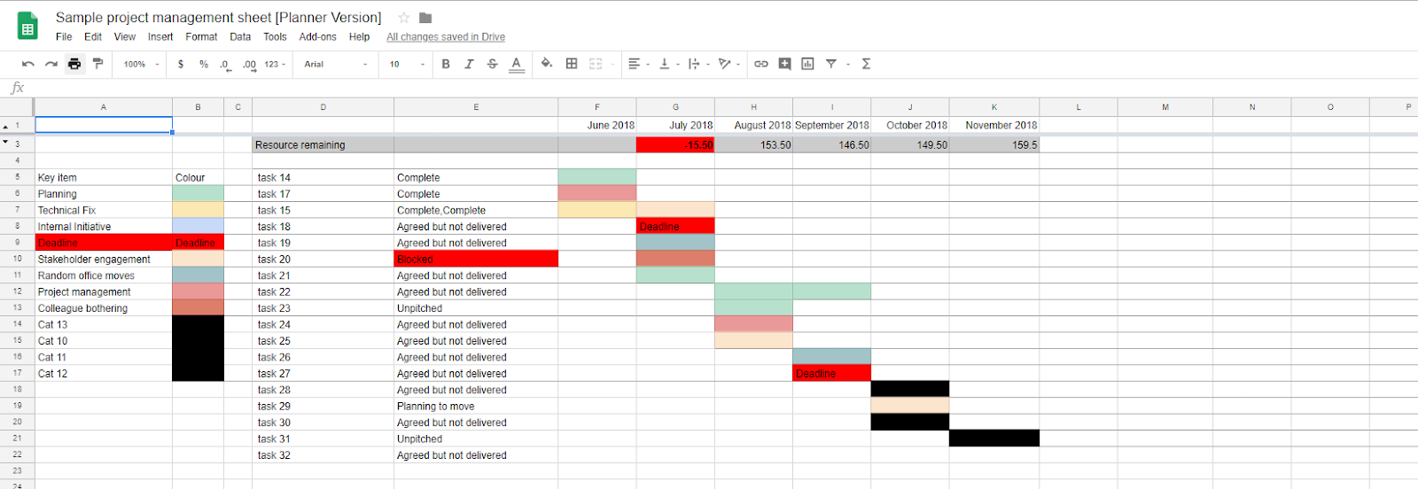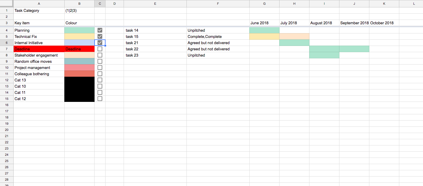 The formula first checks if the task or month cells are blank. If not, it looks in the month cell in its column and cross-references with the task cell in its row. Where the intersection of a month and task matches a task in our Task View (as in the task in that row is taking place during the month in that column), the filter formula will return the category. For those interested, this might also have been achieved with index-match, but filter lets us match with RegEx so we can give multiple matching options and they don’t have to match exactly. Because we split tasks across multiple months, we need to be flexible in our matching.
