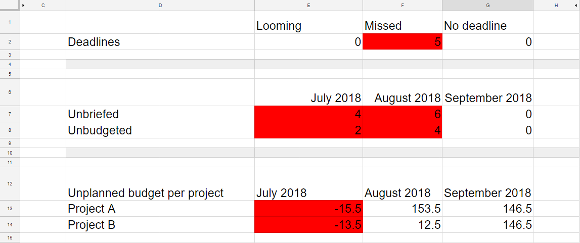 1. Alerts Dashboard tab, which shows you the numbers of deadlines upcoming or missed, the work you need to budget for or brief, and how much unplanned budget you have per project, per month (where budget could just be internal people-hours, as that is still finite).