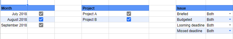 Normally we’ll hide row one, but it’s visible to show you a formula that looks at all of the categories and filters them to just those where the tick-box next to them is ticked. If there are none, it returns “(d|Deadline)” meaning “either a number, or the word Deadline” in RegEx-speak (so anything in our list), because the vertical pipe “|” means “or” and “d” means “number.”