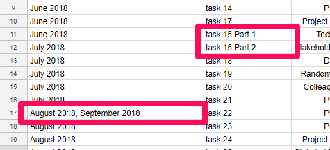 If you don’t want the task to be completely equally split between different time periods, you can write “Part 1” or “Part 2” next to a task. As long as you write just “Part” and then numbers at the end of the name, that’ll be stripped out in column O of the task list tab so the different parts of a task will be combined into one record in things like the Gantt chart.