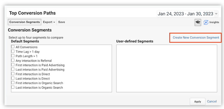 Pro tip: Set the date range to the last three months. Remember, the time lag to conversion can run into days or weeks, so set your date range for at least the last three months. This is also often enough time to gain actionable data.