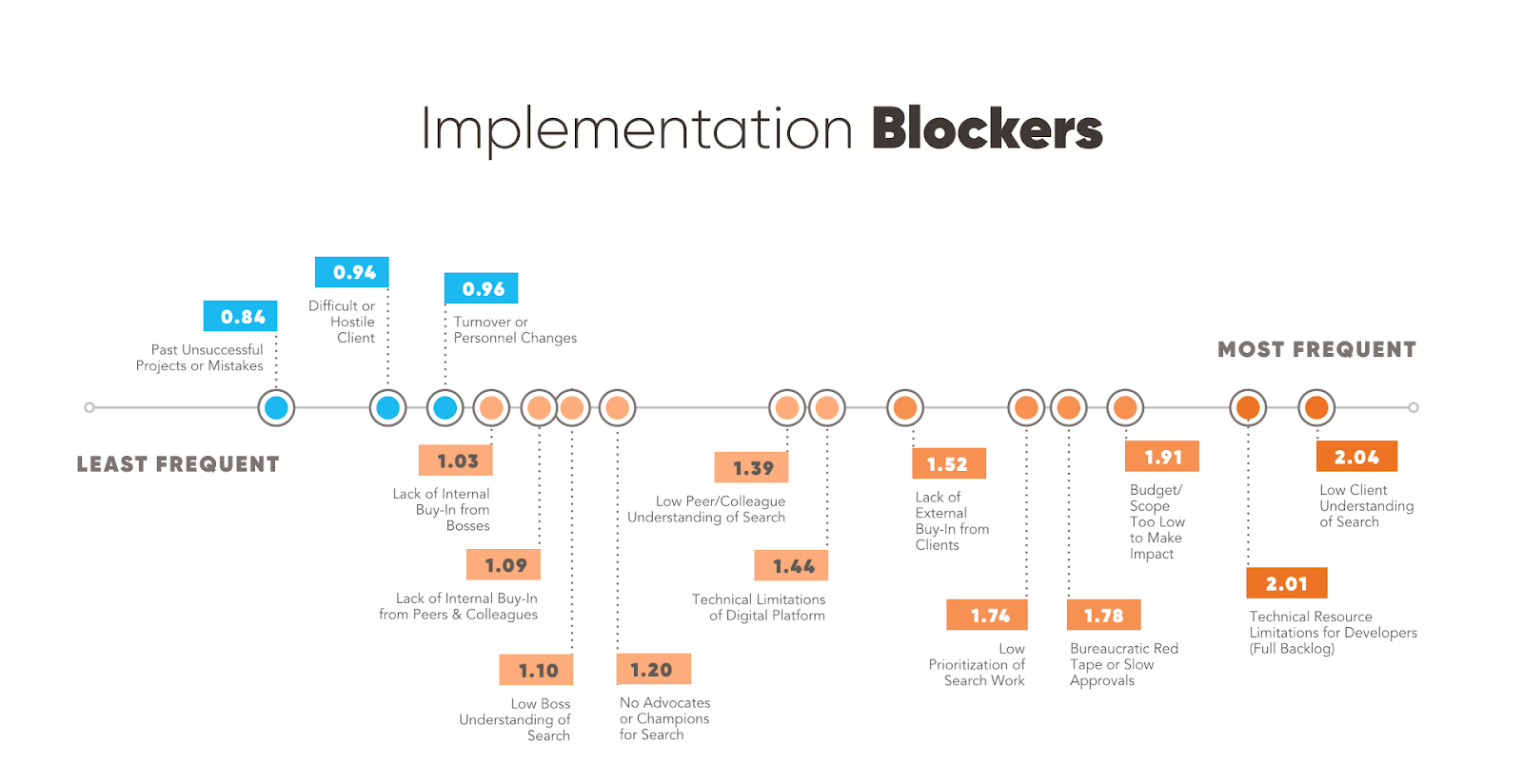 Challenges to implementation tend to be organizational, people, integration, and process problems. Conducting a search maturity assessment with your client can be eye-opening to what needs to be solved internally before great search work can be implemented. Pairing a search capabilities model with an organizational maturity model gives you a wealth of knowledge and tools to help your client.